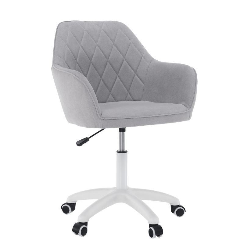 Nadčasové kancelárske kreslo kombinuje nadčasový dizajn s moderným a retro štýlom. Čalúnené príjemnou sivou látkou a postavené na stabilnej kovovej konštrukcii v bielej farbe, je ideálnou voľbou pre pohodlné a štýlové sedenie počas dlhých pracovných hodín