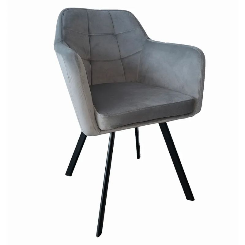 Dizajnové kreslo v svetlosivej zamatovej látke so štýlovými čiernymi kovovými nohami prináša do vášho interiéru luxusný vzhľad a moderný dizajn. Jeho dekoratívne prešitie dodáva kreslu sofistikovaný charakter, pričom je ideálne pre stolovanie v jedálni alebo oddych v obývacej izbe, kancelárii či rokovacej miestnosti.