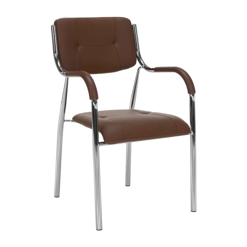 Elegantná stohovateľná stolička čalúnená kvalitnou hnedou ekokožou, doplnená chrómovými nohami. Pre pohodlie počas sedenia sú k dispozícii opierky na ruky. Vďaka stohovateľnej konštrukcii šetrí miesto a je veľmi praktická na presúvanie