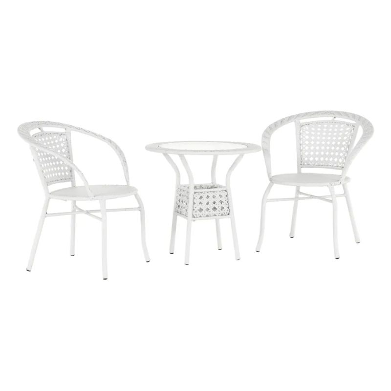 Elegantný 3-dielny set z bieleho umelého ratanu pozostávajúci z dvoch kresiel a okrúhleho stola s vrchnou doskou z tvrdeného skla. Set je odolný, ľahko sa udržiava a prináša štýlový komfort pre vašu záhradu