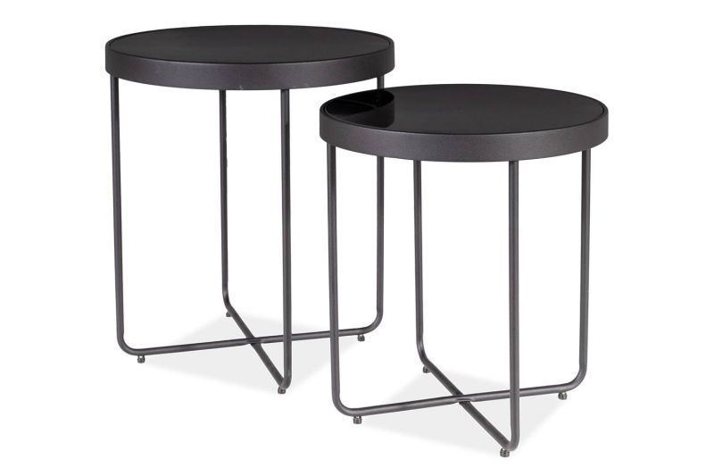 Set konferenčných stolíkov v čiernej farbe je navrhnutý s ohľadom na moderné, minimalistické a industriálne štýlové interiéry. Atraktivita setu je zvýraznená použitím okrúhlych dosiek stola z tvrdeného skla a charakteristickou kovovou podnožou v štýle lyžín.