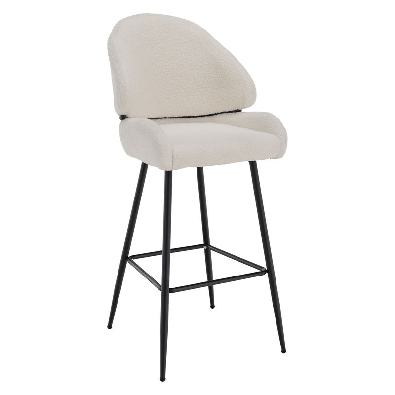 Moderná barová stolička v bielej Bouclé látke s čiernou kovovou konštrukciou v sebe spája eleganciu, pohodlie a výrazný dizajn. Hebké čalúnenie a jemne zaoblené tvary vytvárajú luxusný, no zároveň útulný vzhľad, ktorý zapadne do každého štýlového interiéru