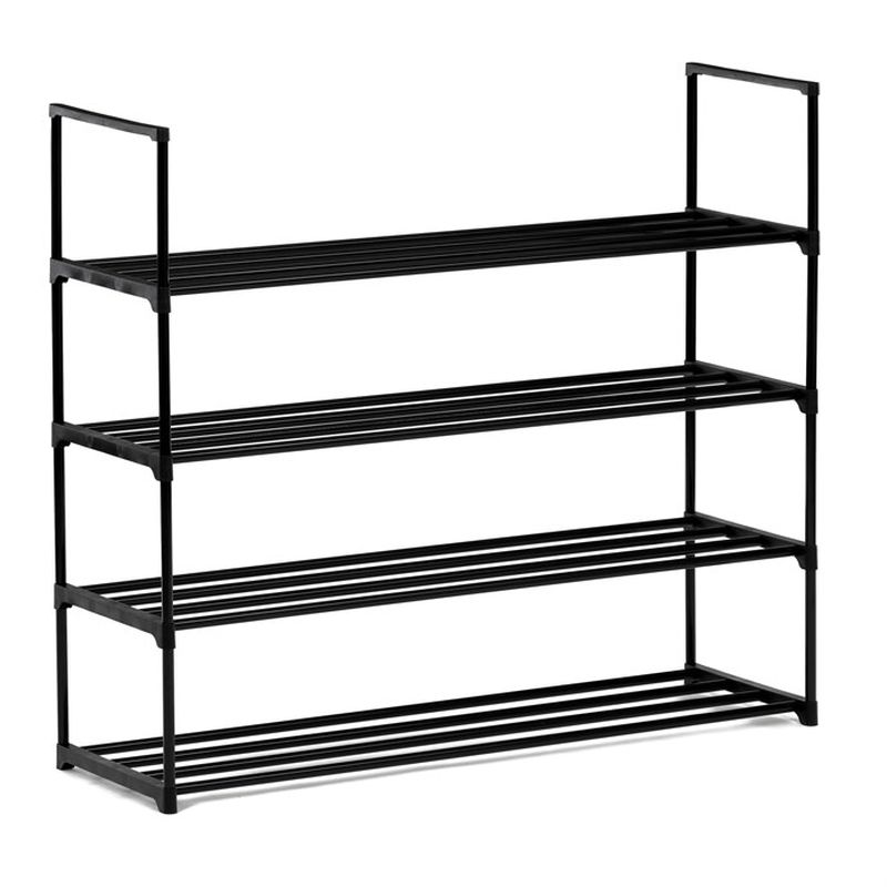 Praktický botník s čiernou kovovou konštrukciou a štyrmi policami poskytuje dostatok miesta pre uskladnenie obuvi. Otvorený dizajn zaručuje dobrú ventiláciu a jednoduchý prístup