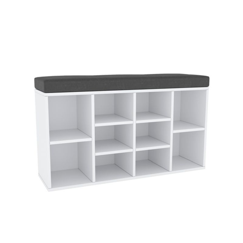 Praktický botník s lavicou v čistom bielom prevedení, ktorý nielen usporiada vaše topánky, ale poskytuje aj pohodlné miesto na sedenie. Disponuje desiatimi otvorenými policami na úložný priestor