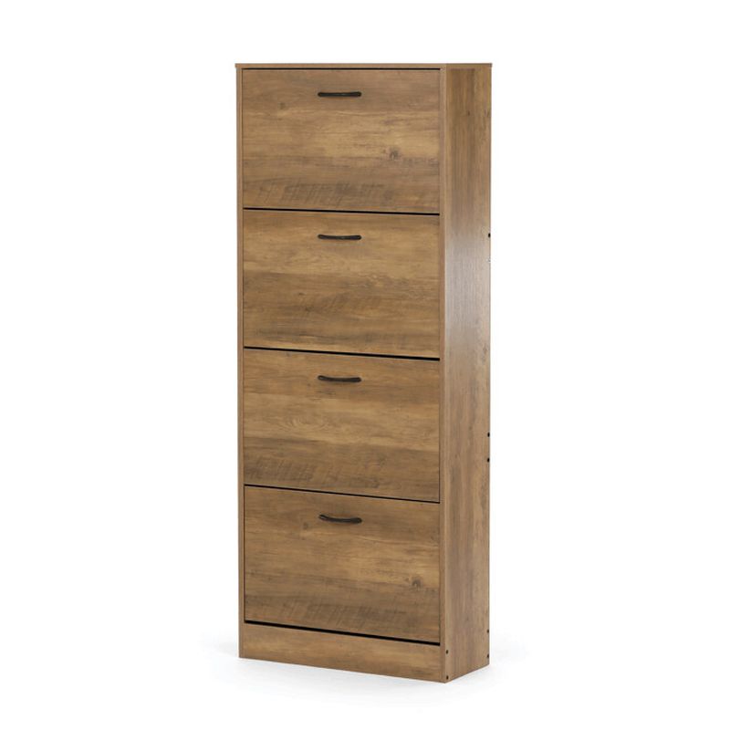 Praktický botník so štyrmi výklopnými priehradkami v dekore brestového dreva prinesie do vašej predsiene alebo chodby prirodzený vzhľad a dostatok priestoru na organizované uloženie obuvi.