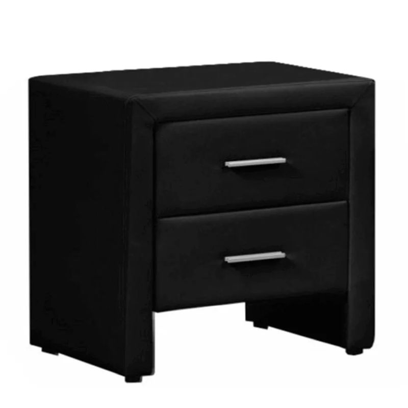 Praktický a funkčný nočný stolík potiahnutý čiernou ekokožou, ktorý skvele doplní vašu spálňu. Ponúka dostatok úložného priestoru vďaka dvom šuplíkom s kovovými úchytkami. Stolík stojí na nízkych nožičkách, ktoré šetria podlahu a zároveň dodávajú elegantný vzhľad