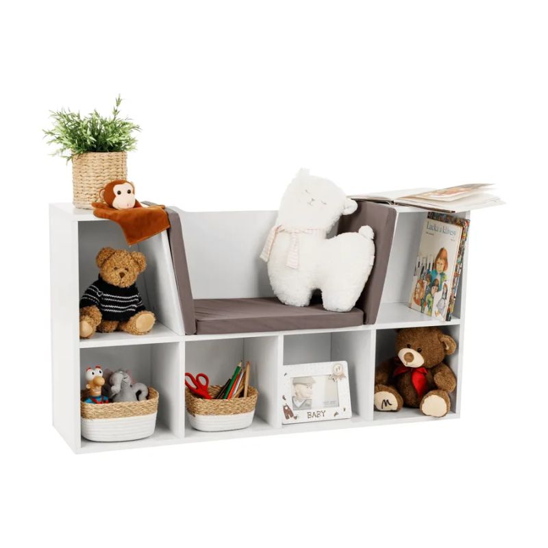 Praktická knižnica z DTD laminovanej v sviežom bielom prevedení. Ponúka šesť políc na knihy a integrované miesto na sedenie s tromi sivými látkovými vankúšmi pre pohodlie pri čítaní. Vhodná do detskej izby, škôlky či klubovne
