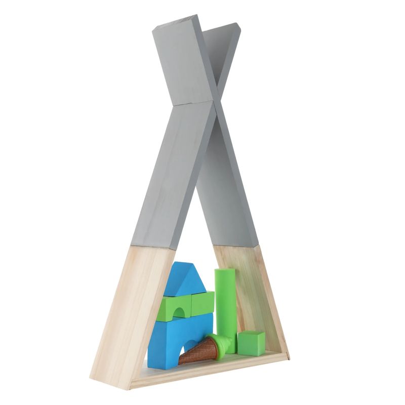 Závesná detská polička z masívneho dreva v jemnom spojení sivej a prírodnej farby, ktoré dodávajú hravý a optimistický dizajn