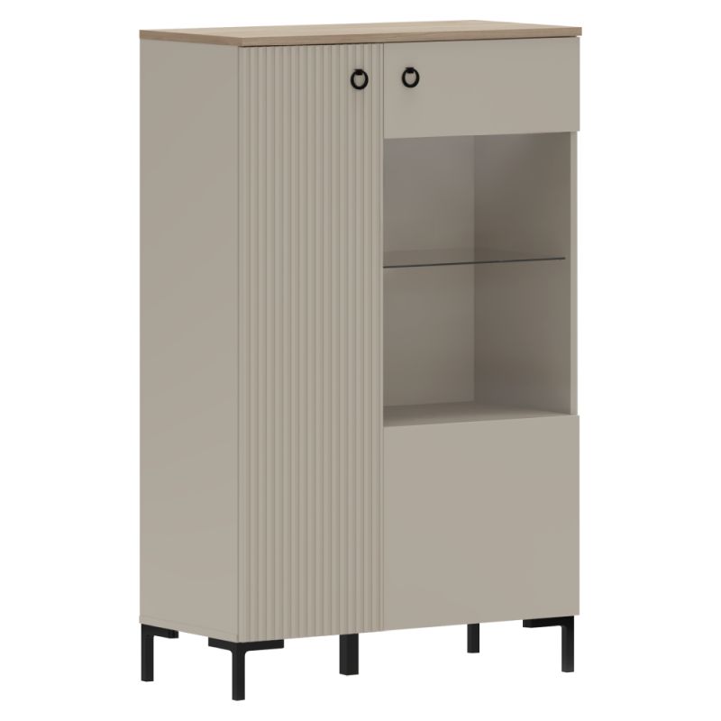 Precízne spracované frézované dvierka z fóliovanej MDF dodávajú vitríne jedinečný charakter, zatiaľ čo korpus z laminovanej DTD zabezpečuje pevnosť a dlhú životnosť. Sklenená výplň dvierok spolu so sklenenou policou vytvára elegantný priestor na vystavenie dekorácií, skla alebo obľúbených predmetov.