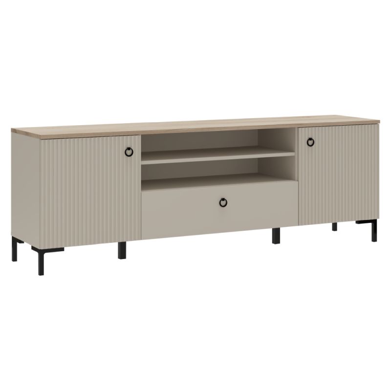 TV stolík zaujme precíznym spracovaním a originálnym dizajnom. Frézované dvierka z MDF dodávajú nábytku jedinečný charakter, zatiaľ čo kombinácia farieb sivohnedá Taupe a dub silverjack pôsobí elegantne, moderne a zároveň útulne.