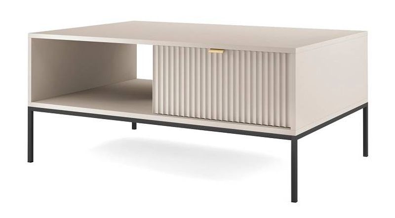 Moderný drážkovaný konferenčný stolík, ktorý elegantne a prakticky doplní váš interiér. Kombinácia cashmere a čiernej farby, ozdobné drážkované predné časti a brúsené zlaté úchytky z hliníka dodávajú stolíku sofistikovaný vzhľad.