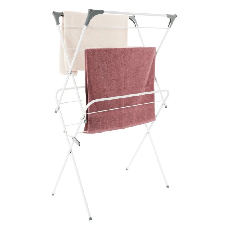 Praktický dvojdielny sušiak na bielizeň, ktorý sa nerozkladá do šírky, ale do výšky. Disponuje štyrmi krídlami pre efektívne sušenie. Vyrobený z kovu v bielej farbe, doplnený sivými plastovými prvkami