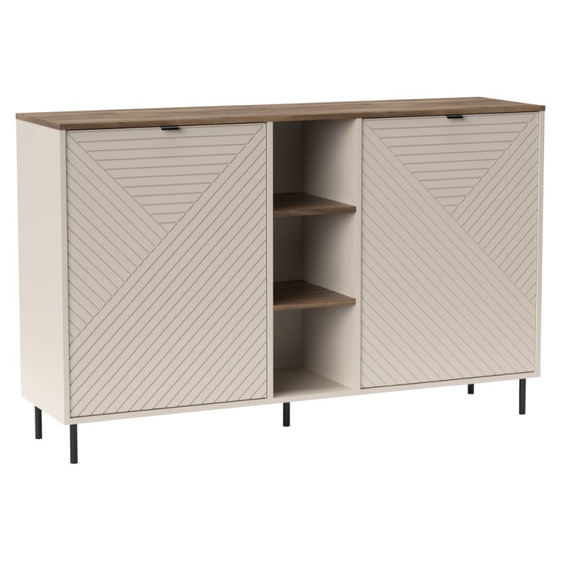 Moderná dvojdverová komoda v kombinácii jemného kašmíru a prírodného dubu castello je ideálnym riešením pre štýlové a praktické usporiadanie úložného priestoru. Čierne kovové úchytky a nožičky zvýrazňujú moderný dizajn a dodávajú nábytku elegantný kontrast
