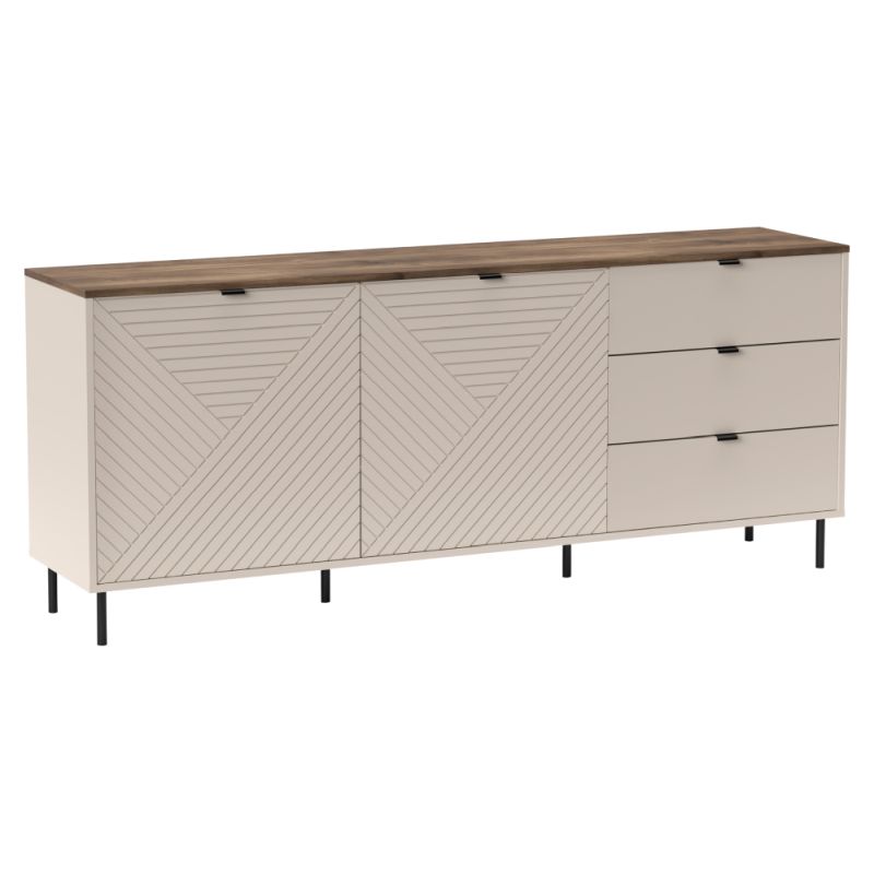 Štýlová dvojdverová komoda s tromi šuplíkmi a úložným priestorom rozdeleným policami. Kombinácia kašmírového odtieňa a dekoru dub castello pôsobí moderne a jemne, zatiaľ čo čierne kovové prvky dodávajú kontrast a eleganciu