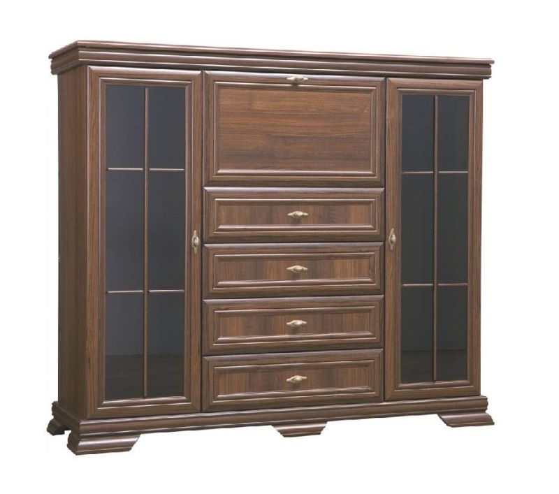 Veľkorysý Úložný Priestor a Unikátny Barový Prvok: Komoda KK7 obsahuje štyri priestranné zásuvky a dve veľké skrinky so sklom a policami vo vnútri, čo poskytuje bohaté možnosti pre uskladnenie a vystavenie vašich obľúbených predmetov. Horná skrinka s policami pripomína bar, čo pridáva tomuto kúsku nábytku jedinečný charakter a zvýrazňuje luxusný nádych.