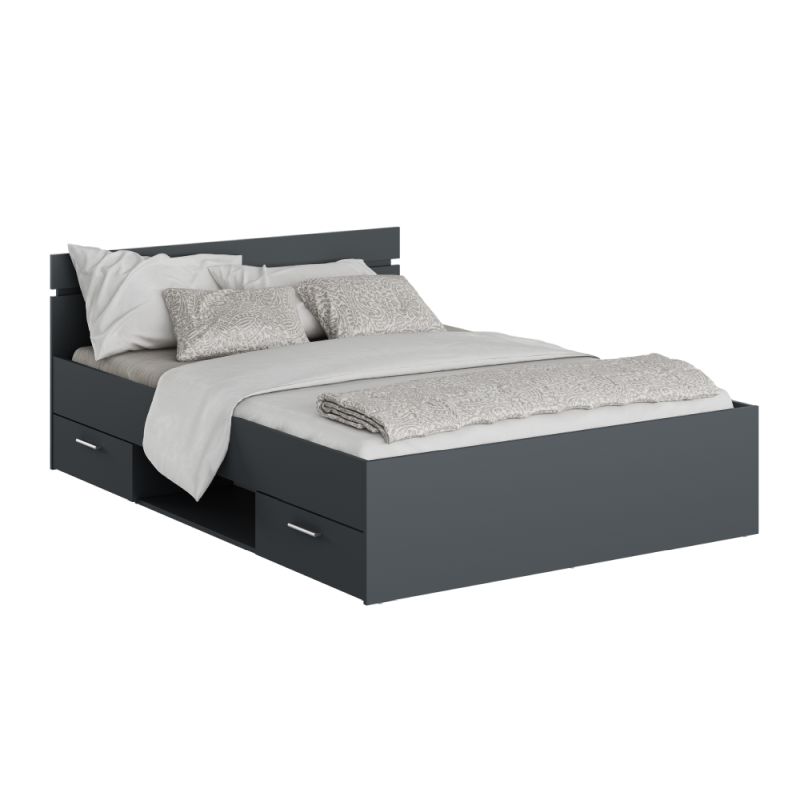 Moderná posteľ v nadčasovom grafitovom prevedení prináša do interiéru šmrnc a praktické riešenie úložného priestoru. Spacia plocha 140x200 cm poskytuje pohodlie pre jednu alebo dve osoby. Pod posteľou sa nachádzajú dva šuplíky a otvorený priestor na odkladanie, ktoré si môžete umiestniť z pravej alebo ľavej strany