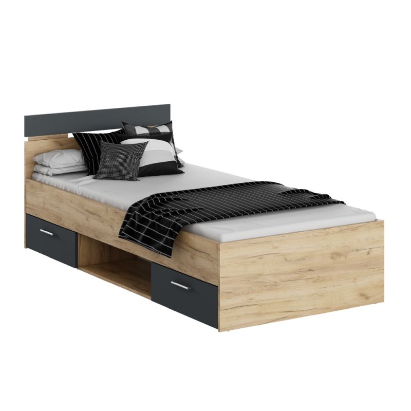 Elegantná posteľ v kombinácii dub artisan a grafit ponúka praktické riešenie do študentských či detských izieb. Disponuje dvoma šuplíkmi a otvoreným odkladacím priestorom, ktoré sa nachádzajú pod lôžkom. Šuplíky je možné namontovať z pravej alebo ľavej strany