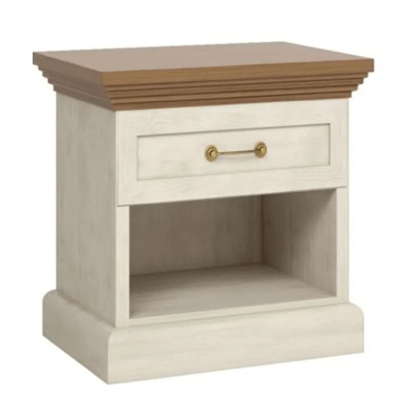 Nočný stolík v provensálskom štýle zaujme kombináciou čistých línií a elegantných detailov. Otvorený úložný priestor a šuplík s kovovou úchytkou ponúkajú praktické využitie