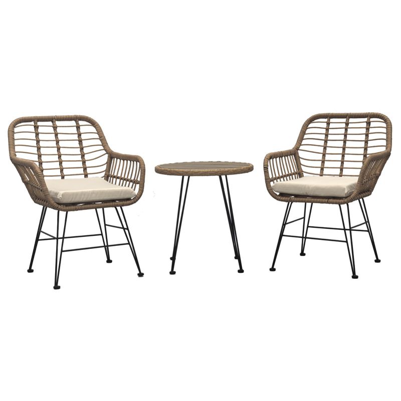 Tento štýlový záhradný set je ideálnou voľbou pre moderné vonkajšie posedenie. Obsahuje dve pohodlné kreslá a okrúhly stolík s doskou z odolného polywoodu. Pevná oceľová konštrukcia a polyratanový výplet zaručujú dlhú životnosť aj komfort. Minimalistický dizajn sa ľahko hodí na balkón, terasu alebo záhradu. Set obsahuje béžové sedáky (5 cm) z vodeodolného polyesteru.