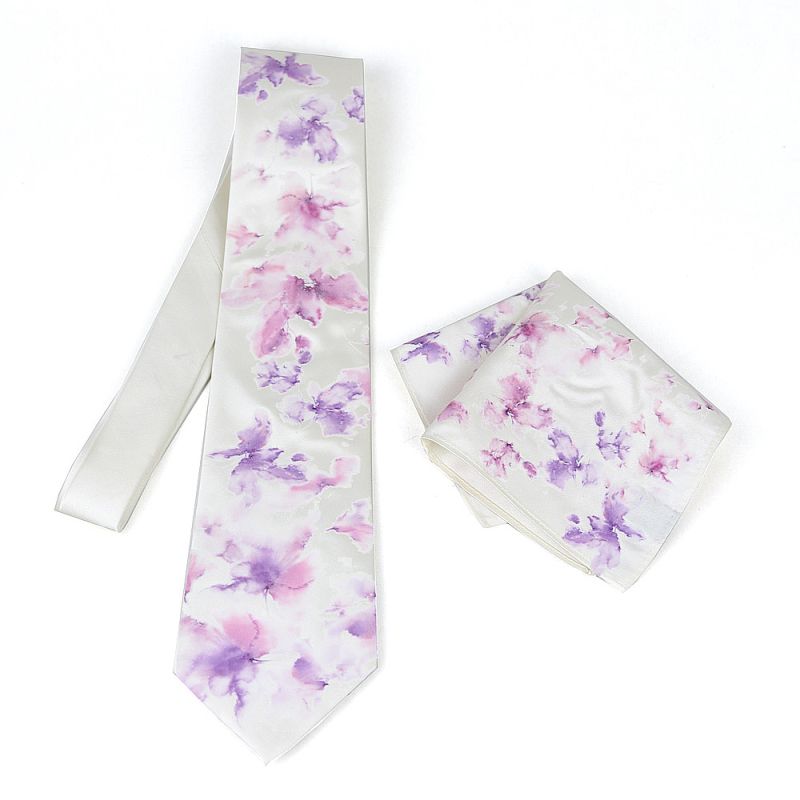 Hodvábna kravata + vreckovka - Fialové kvetiny 100% hodváb