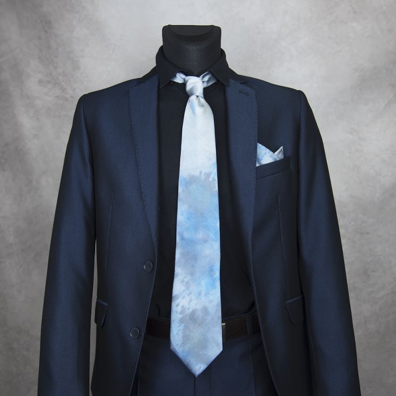 Exkluzívna kombinácia hodvábnej kravaty a vreckovky, ktorá je výsledkom ručnej práce na Slovensku. Tento súbor je unikátny nielen svojím dizajnom a farbami, ale aj tým, že existuje len jeden kus, čo z neho robí skutočne jedinečný doplnok.
