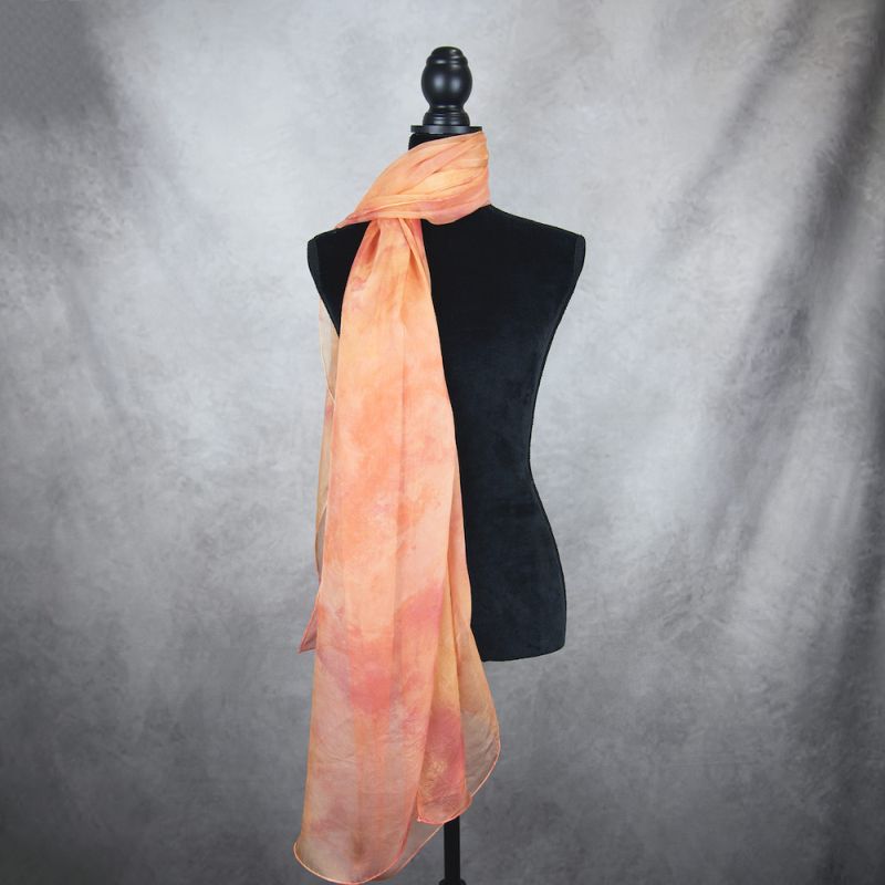 Postup tvorby: Šál je farbený špeciálnym spôsobom pomocou 100% prírodného pigmentu určeného priamo na farbenie hodvábu. Farba je zafixovaná, šál je vypratý a ošetrený fixátorom farieb. Okraje sú ručne zrolované a ručne prešité, následne je celý šál vyžehlený.