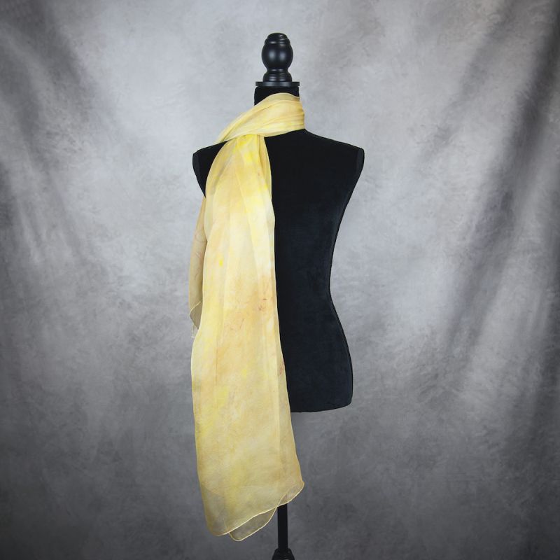 Postup tvorby: Šál je farbený špeciálnym spôsobom pomocou 100% prírodného pigmentu určeného priamo na farbenie hodvábu. Farba je zafixovaná, šál je vypratý a ošetrený fixátorom farieb. Okraje sú ručne zrolované a ručne prešité, následne je celý šál vyžehlený.