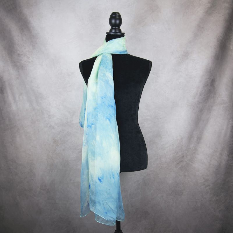 Postup tvorby: Šál je farbený špeciálnym spôsobom pomocou 100% prírodného pigmentu určeného priamo na farbenie hodvábu. Farba je zafixovaná, šál je vypratý a ošetrený fixátorom farieb. Okraje sú ručne zrolované a ručne prešité, následne je celý šál vyžehlený.