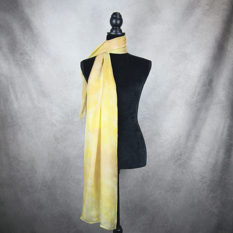 Postup tvorby: Šál je farbený špeciálnym spôsobom pomocou 100% prírodného pigmentu určeného priamo na farbenie hodvábu. Farba je zafixovaná, šál je vypratý a ošetrený fixátorom farieb. Okraje sú ručne zrolované a ručne prešité, následne je celý šál vyžehlený.