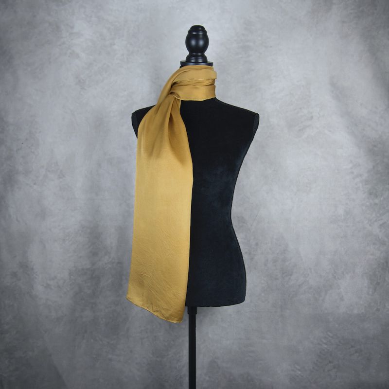 Elegantný medený hodvábny šál je vyrobený zo 100% prírodného hodvábu typu crepe-saten, ktorý sa radí medzi najluxusnejšie materiály na svete. Vďaka svojmu lesku a hebkosti pôsobí výnimočne luxusne a je nádherný na pohľad aj príjemný na dotyk