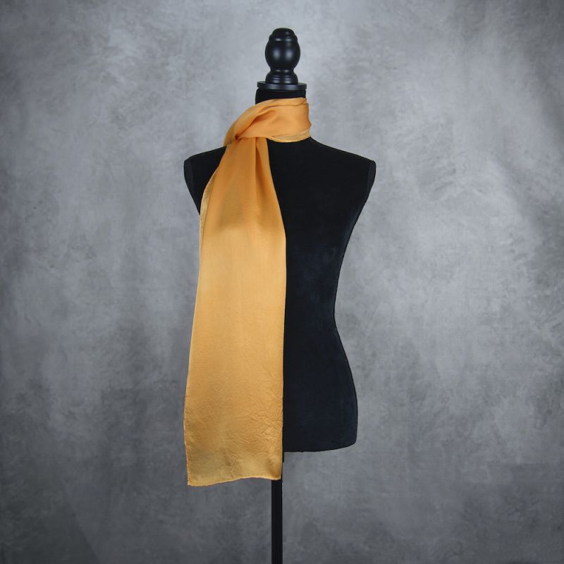 Elegantný oranžový hodvábny šál je vyrobený zo 100% prírodného hodvábu typu crepe-saten, ktorý sa radí medzi najluxusnejšie materiály na svete. Vďaka svojmu lesku a hebkosti pôsobí výnimočne luxusne a je nádherný na pohľad aj príjemný na dotyk
