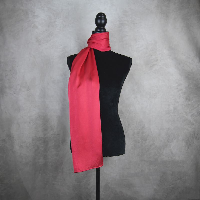 Elegantný ružovo-červený hodvábny šál je vyrobený zo 100% prírodného hodvábu typu crepe-saten, ktorý sa radí medzi najluxusnejšie materiály na svete. Vďaka svojmu lesku a hebkosti pôsobí výnimočne luxusne a je nádherný na pohľad aj príjemný na dotyk