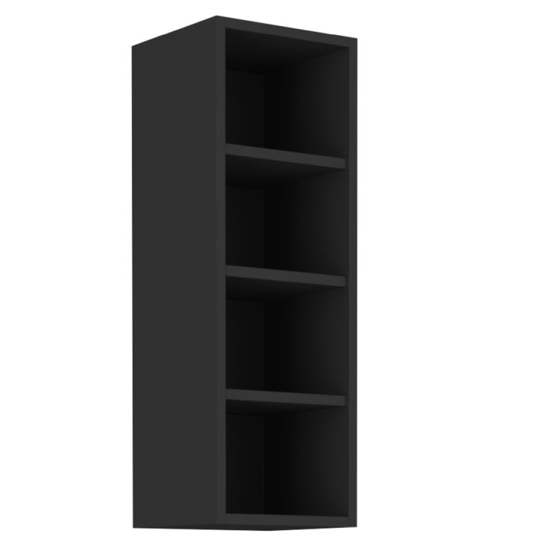 Horná policová skrinka je bez dvierok vo farebe čierny mat
