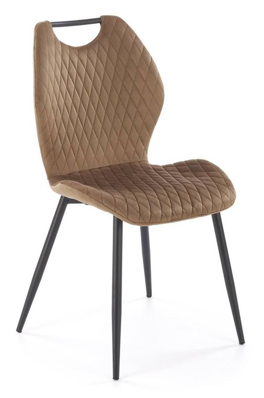 Elegantná jedálenská stolička 569 kombinuje moderný dizajn s praktickým komfortom. Bohato prešívané operadlo dodáva stoličke luxusný a sofistikovaný vzhľad, zatiaľ čo jemná velvetová (zamatová) látka sa postará o pohodlné a príjemné sedenie.