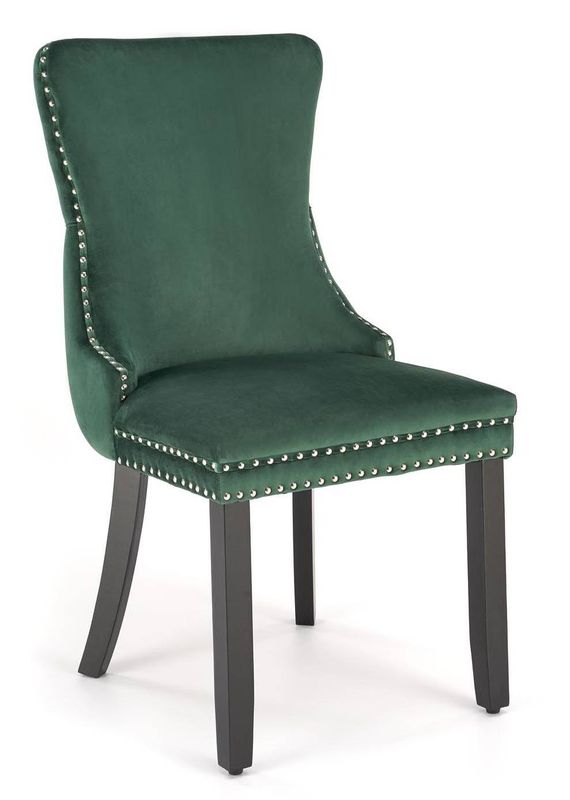 Elegantná jedálenská stolička, ktorá kombinuje štýlový dizajn a pohodlie, vhodná do moderných, glamour aj klasických interiérov. Operadlo je čalúnené jemnou látkou v zelenej farbe a zdobené prešívaním a dekoratívnymi čalúnnickými klincami, ktoré podčiarkujú luxusný charakter stoličky.