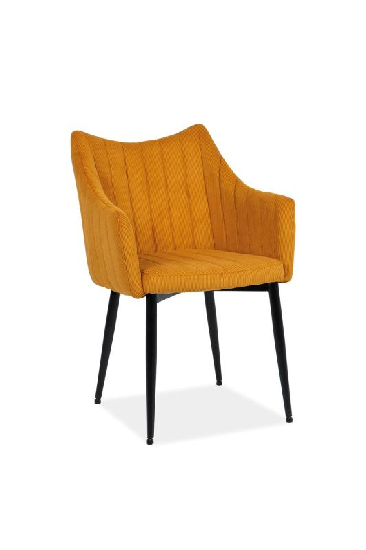 Moderná jedálenská stolička kombinuje pôsobivý dizajn a funkčnosť. Svojím unikátnym vzhľadom a žiarivou žltou manšestrovou látkou pridáva do každého interiéru výrazný štýlový akcent.