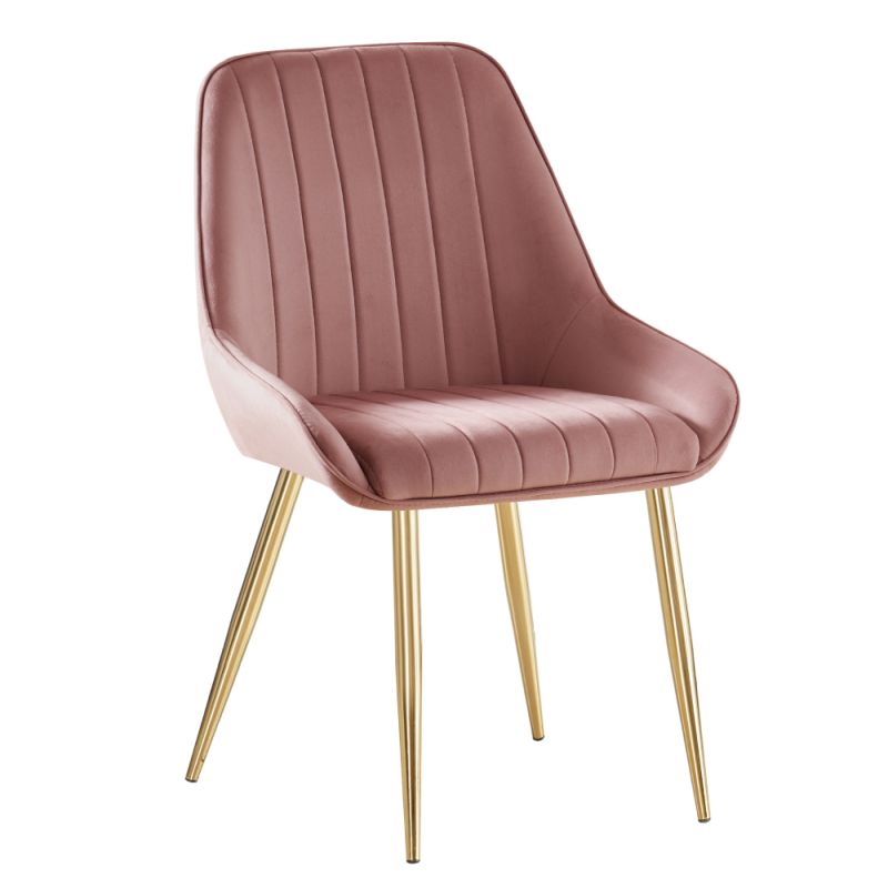 Moderná jedálenská stolička s očalúneným sedadlom z jemnej Velvet látky v ružovej farbe. Stabilitu a eleganciu zabezpečujú kovové nohy v zlatom chrómovom prevedení. Pohodlné sedenie dopĺňa tvarovaná chrbtová opierka a podrúčky