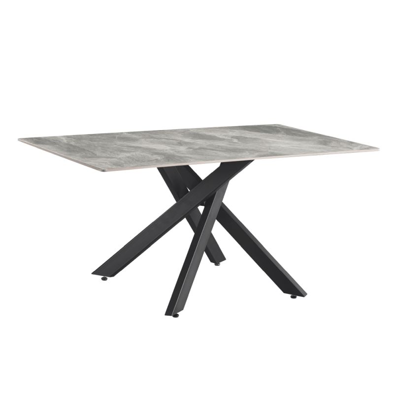 Elegantný jedálenský stôl s keramickou doskou v odtieni svetlosivého mramoru a čiernymi kovovými nohami. Tento stôl je ideálny pre 6-8 osôb a ponúka moderný dizajn, ktorý upúta každého návštevníka