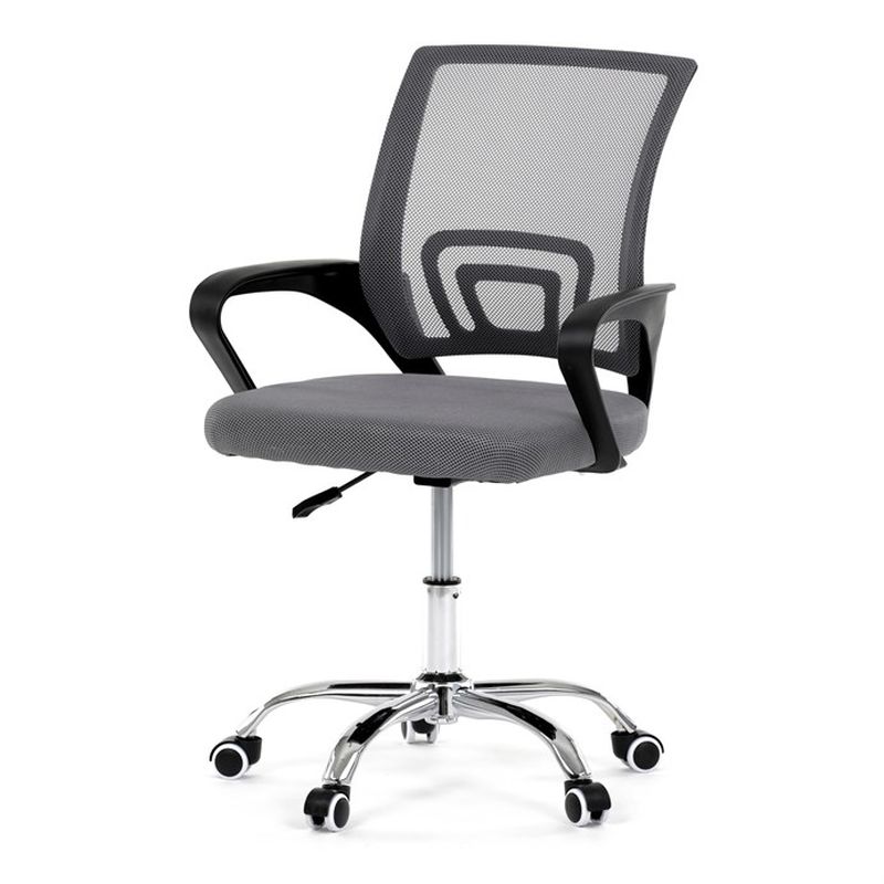 Moderná kancelárska stolička kombinuje štýlový dizajn s komfortom pre každodennú prácu. Operadlo je pokryté priedušnou sivou sieťovinou MESH, ktorá zabezpečuje optimálnu ventiláciu a podporu chrbtice. Čierne pevné plastové podrúčky dopĺňa chrómový kríž s kolieskami pre ľahký a stabilný pohyb. Výškovo nastaviteľný plynový piest umožňuje prispôsobenie výšky sedenia podľa potreby