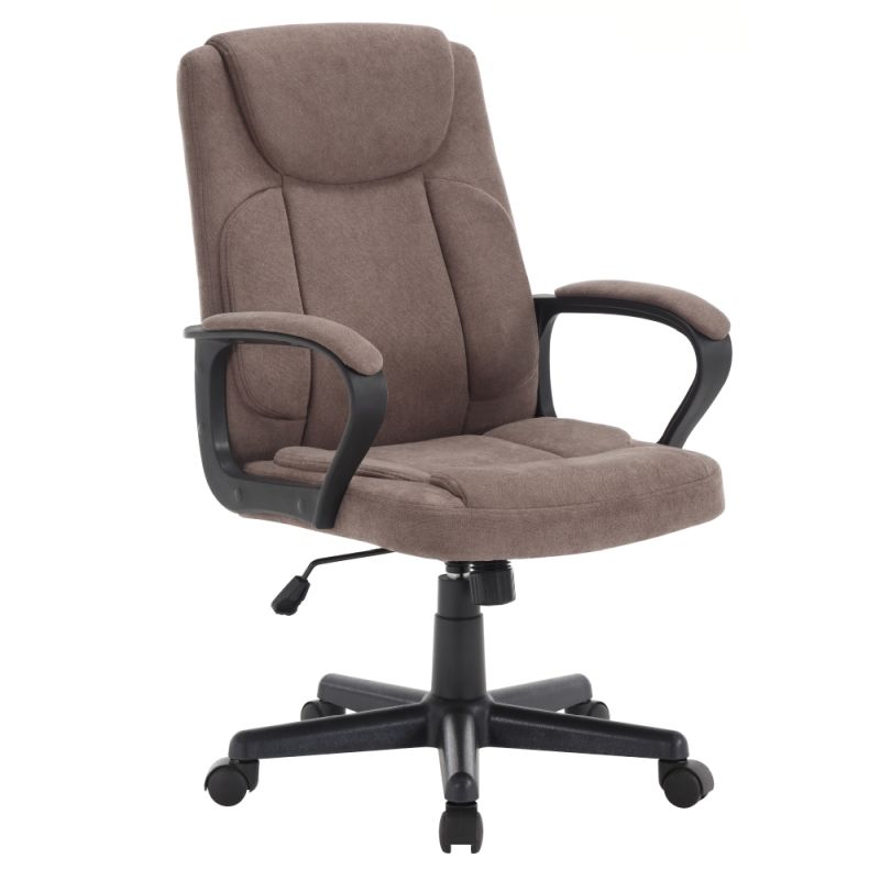 Elegantné kancelárske kreslo s čalúnenými opierkami na ruky je ideálne na dlhé hodiny práce v kancelárii alebo doma. Hnedá látka dodáva kreslu sofistikovaný a teplý vzhľad, zatiaľ čo čierna plastová podstava zabezpečuje stabilitu a odolnosť