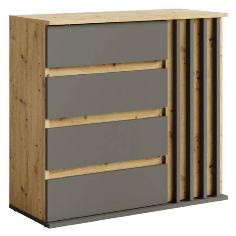 Komoda, ktorá spája moderný dizajn s praktickým úložným priestorom, je ideálna do predsiene, obývačky, spálne či kancelárie. Vyrobená z DTD a laminovanej MDF v elegantnej kombinácii grafit a dub artisan. Ponúka jednu skrinku s policou a štyri šuplíky, ktoré poskytujú dostatok miesta na organizovanie vecí. Ozdobné lamely zvýrazňujú jej moderný a nadčasový charakter