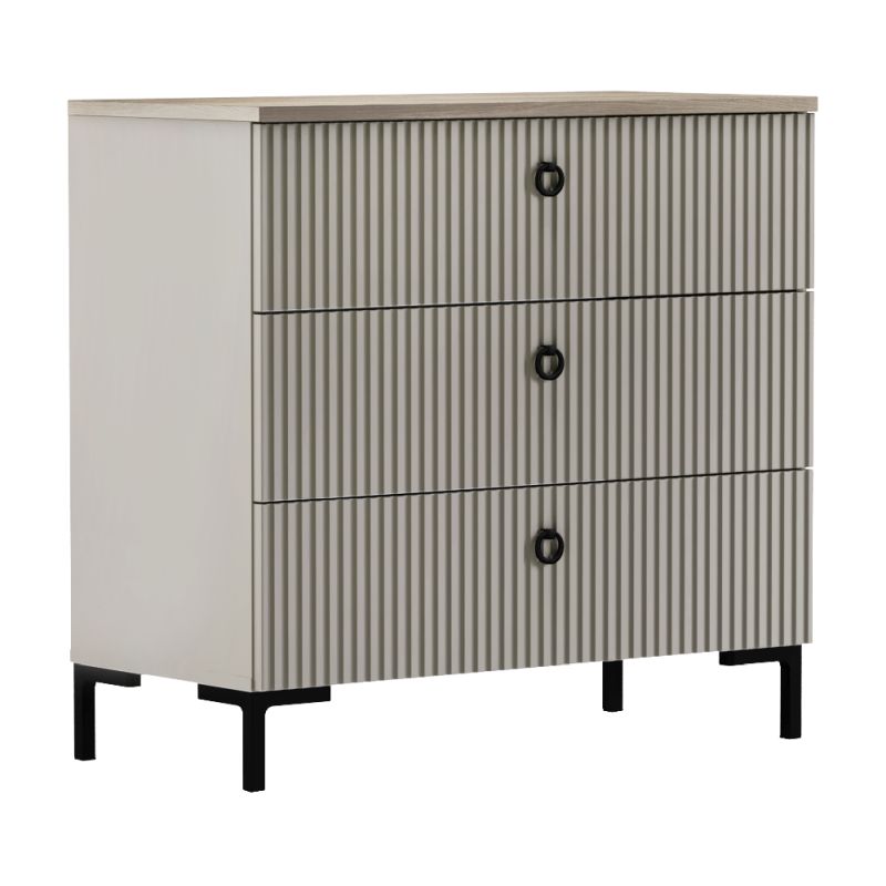 Komoda ponúka praktický úložný priestor v podobe troch priestranných zásuviek, ktoré zabezpečia prehľadné usporiadanie všetkých vašich vecí. Precízne spracovanie MDF čiel s jemným frézovaním v kombinácii s kvalitným korpusom z laminovanej DTD vytvára originálny a štýlový prvok. Čierne kovové úchytky a nožičky dodávajú komode jemný industriálny nádych, zatiaľ čo vrchná doska poskytuje ideálny priestor na dekorácie, ktoré oživia váš interiér.