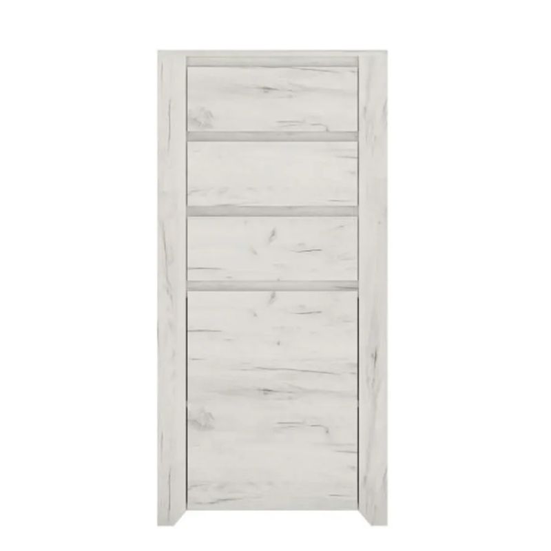 Kompaktná a elegantná komoda v dekore biela craft dodá interiéru štýlový vzhľad. Vrchná časť je vybavená tromi praktickými šuplíkmi, spodná časť ukrýva skrinku s dvierkami, ktorú delí polica na dve úložné plochy