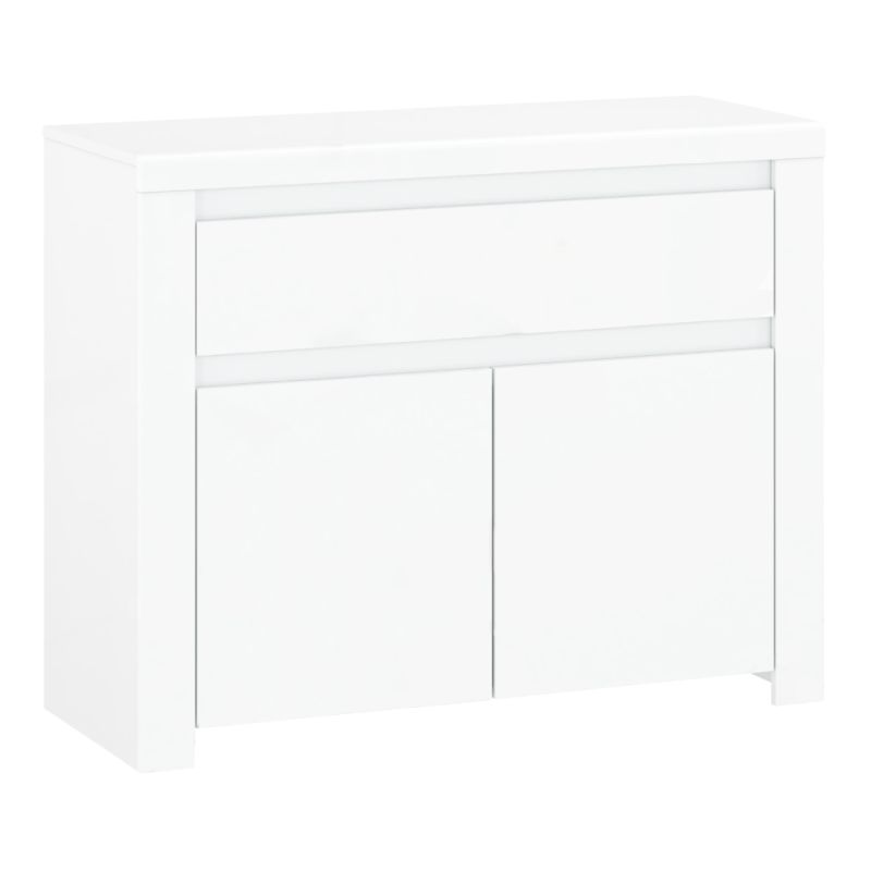 Moderná a nadčasová komoda v elegantnej bielej farbe s lesklým povrchom, ktorý jej dodáva štýlovosť a jemný lesk. Vyrobená je z kvalitnej laminovanej DTD s dvierkami z MDF a ABS hranami pre vyššiu odolnosť. Komoda disponuje jednou zásuvkou a dvojdverovou skrinkou s vnútornou policou, ktorá poskytuje praktický úložný priestor. Dvierka sú bez úchytiek, otvárajú sa ľahkým potiahnutím pre čistý a minimalistický vzhľad