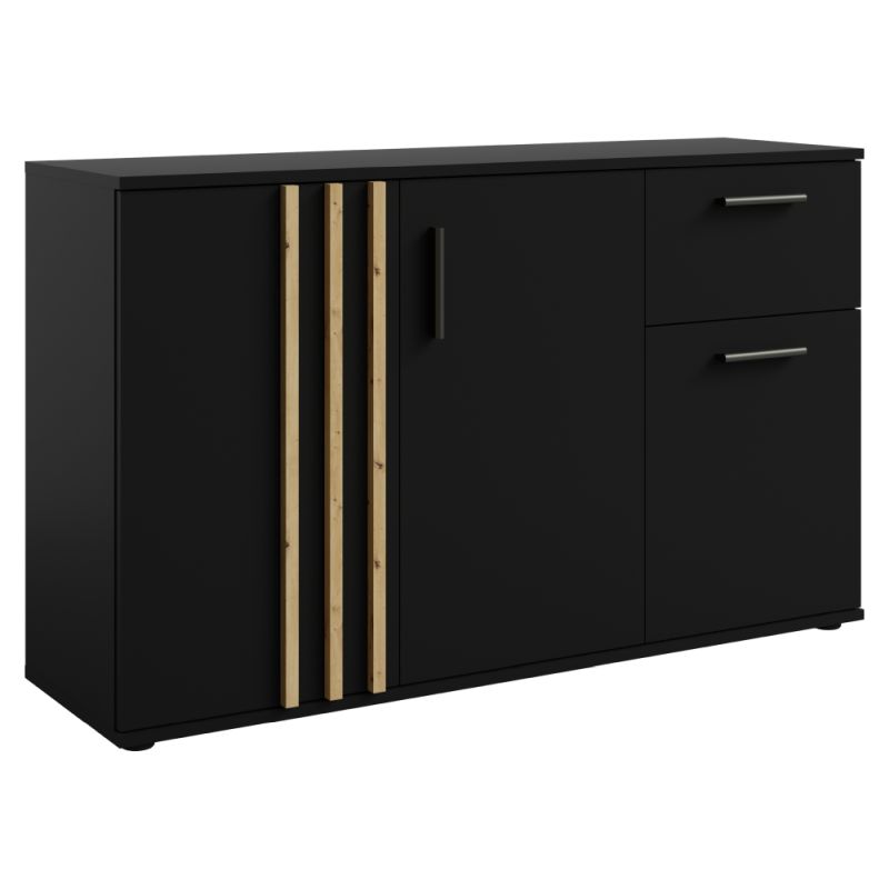 Moderná komoda s praktickým a elegantným dizajnom vhodná do každej miestnosti. Vyrobená z laminovanej DTD a MDF v kombinácii farieb čierna a dub artisan. Trojdverová komoda s jednou policou a jedným šuplíkom poskytuje dostatok úložného priestoru. Dvierka sú ozdobené lamelami, ktoré im dodávajú luxusný vzhľad. Otváranie dverí zabezpečuje čierna úchytka umiestnená iba na jednej strane. Ideálna do menších priestorov, kde ponúka efektívne uskladnenie bez zbytočného zaberania miesta