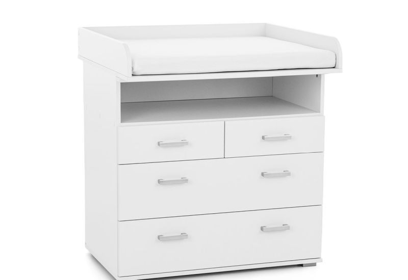 Kvalitný slovenský výrobok - komoda s odnímateľným prebalovacím pultom a matracom. Vo vrchnej časti sa nachádza prebaľovací pult s mäkkým matracom, ktorý je snímateľný a prateľný, a pod ním otvorená polička na drobnosti. Po odobratí prebaľovacieho pultu sa komoda stáva plnohodnotným úložným nábytkom so štyrmi zásuvkami a jednou poličkou, ktoré poskytujú dostatok miesta a jednoduchý prístup k obsahu.