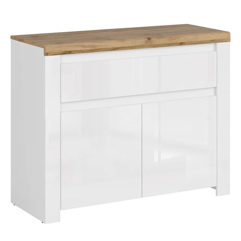 Kompaktná a elegantná komoda v nadčasovej farebnej kombinácii bieleho lesku a dubu Wotan vnesie do interiéru čistotu a sviežosť. Je praktickým riešením pre tých, ktorí hľadajú decentný úložný priestor v modernom prevedení. Obsahuje zásuvku a skrinku s dvomi policami, ktoré poskytujú priestor pre každodenné potreby