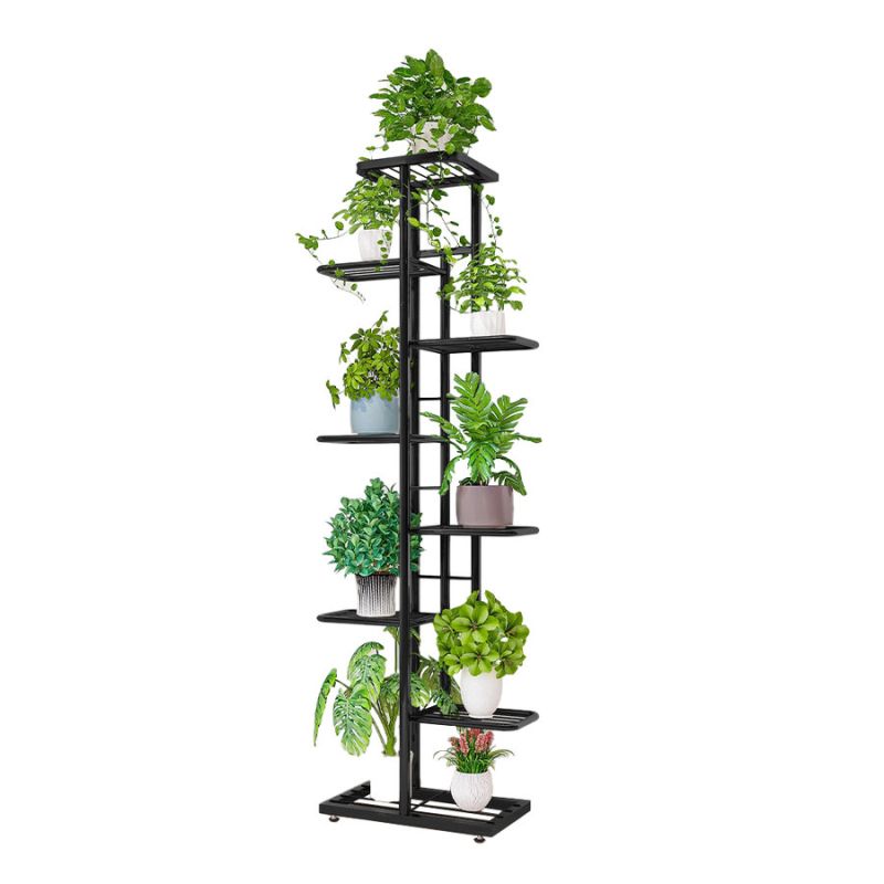 Moderný kovový stojan na kvety v tmavosivej farbe s ôsmimi policami, ktoré unesú až 9 kvetov. Stabilitu zabezpečujú nohy s rektifikačnými skrutkami pre vyrovnanie nerovností podlahy. Vhodný do predsiene, obývačky, haly či kuchyne