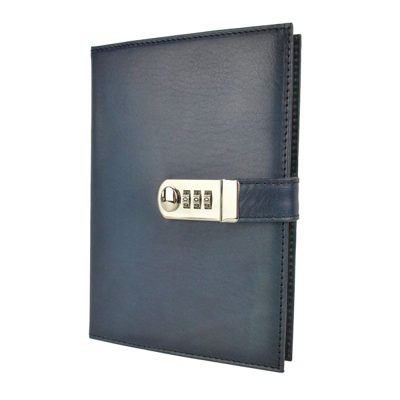 Kožený zápisník XXL s číselným zámkom v tmavo modrej farbe, ručne tieňovaný