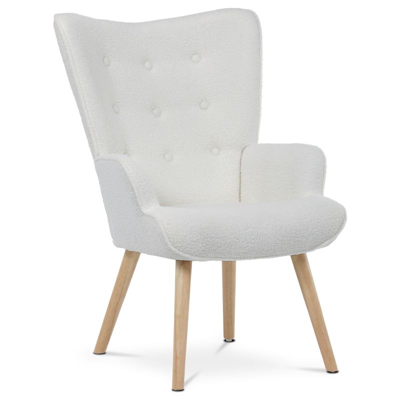 Špecifikácie a Vzhľad: Kreslo je očalúnené bouclé látkou s jemným povrchom, ktorá ponúka nielen estetický vzhľad, ale aj pohodlie pri sedení. Prírodné masívne nohy dopĺňajú celkový elegantný dojem.